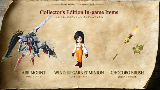 We also get a look at the in-game items included in the FF14 Dawntrail collector’s edition. There’s an Ark mount (the ship-like summon from FF9), along with a Wind-up Garnet minion (also FF9), and a special Chocobo Brush for the new FF14 Pictomancer job arriving in Dawntrail. Yoshida remarks on how many of these items are related to Final Fantasy 9, but says the reason for this remains “a secret” for now.
