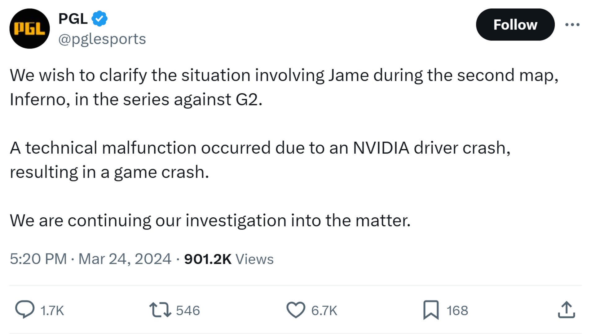 Following the incident, PGL put out a clarifying statement on X, confirming that “a technical malfunction occurred due to an Nvidia driver crash, resulting in a game crash.” The company says it is continuing to investigate the matter, but the damage is naturally already done for Jame and their Virtus Pro teammates.